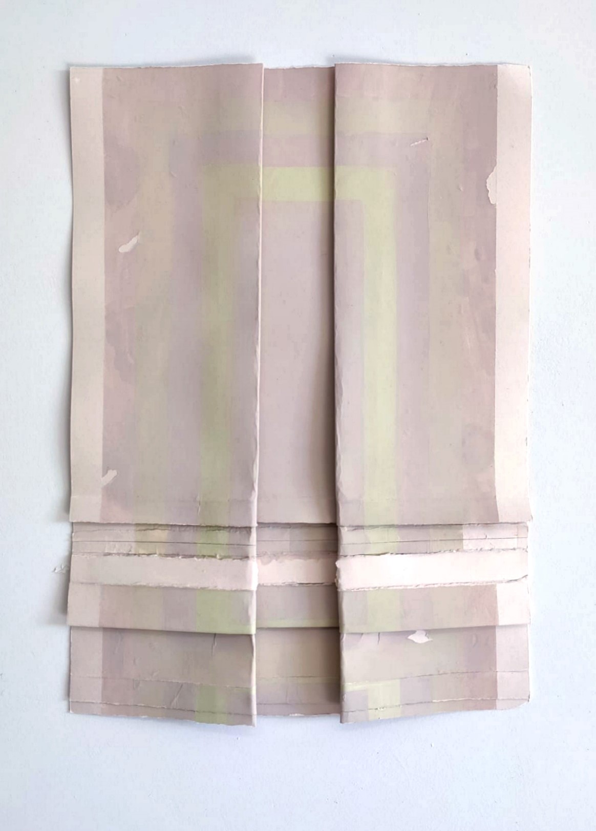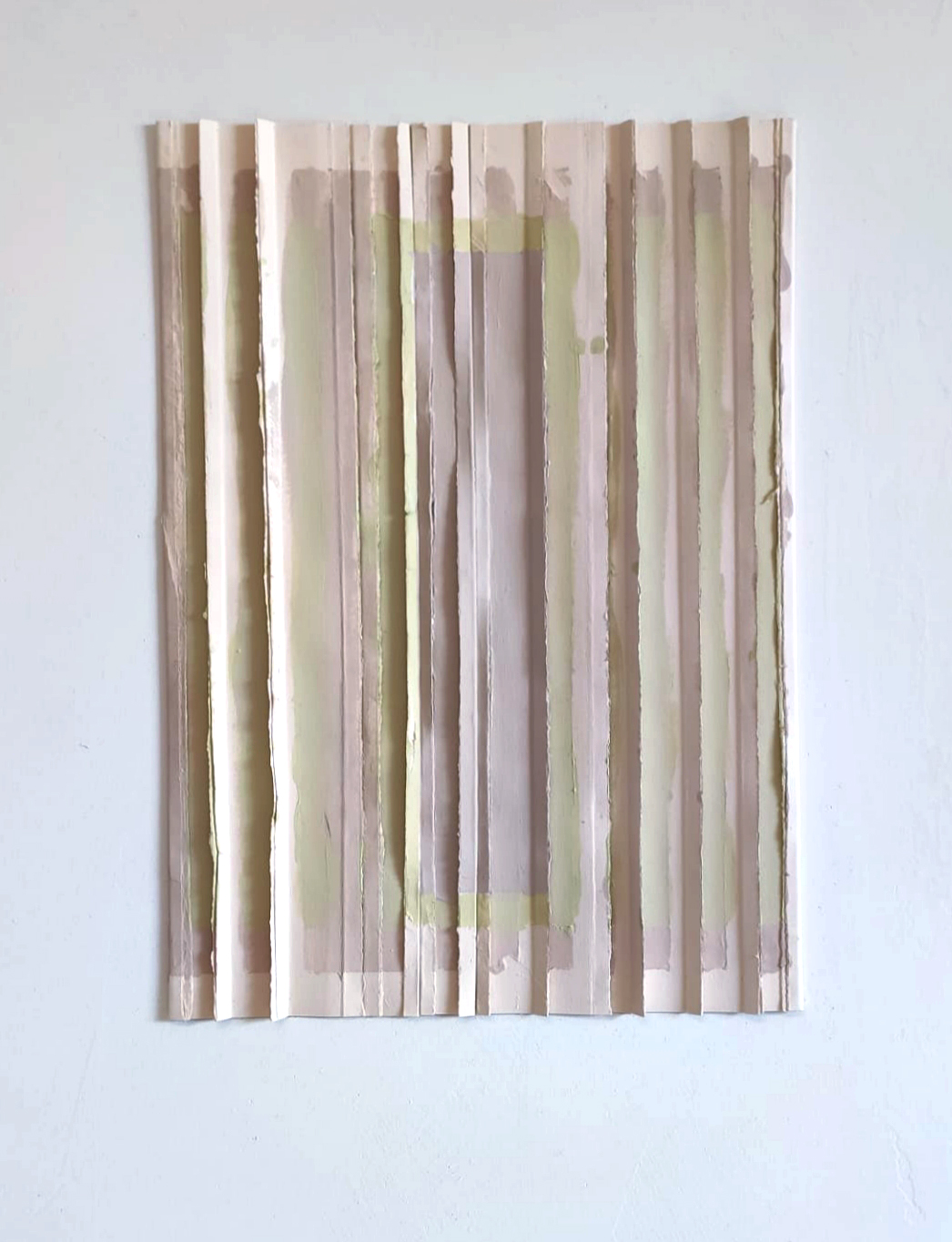 Maria Luísa: A utilização da cor não é uma prioridade ao invés da forma. A preocupação começa na forma e é através da vulnerabilidade do papel que se constrói um corpo como sugestão de paisagem movido pelas possibilidades dos suportes. Não penso na cor como decorativo mas no entanto, é uma escolha posterior à concretização sem a anulação da cor do suporte, sem a pretensão de um referente sendo nelas mesmas uma nova realidade que se cumpre dentro do seu universo. As divisões, subdivisões, rasgos, manuseio são parte integrante da leitura desta série. Prendo-me à ideia de paisagem em suporte vertical, e é através do conhecimento visual da cor que ela se reencontra com a harmonia. No fim, não é relevante ser uma imagem, nem uma representação de paisagem, nem importa ser uma figura. Nesta série através das estrias verticais trabalhei no ritmo e na veracidade do suporte e para isso é necessário servir-me da potencialidade do suporte trespassado pelo pigmento.